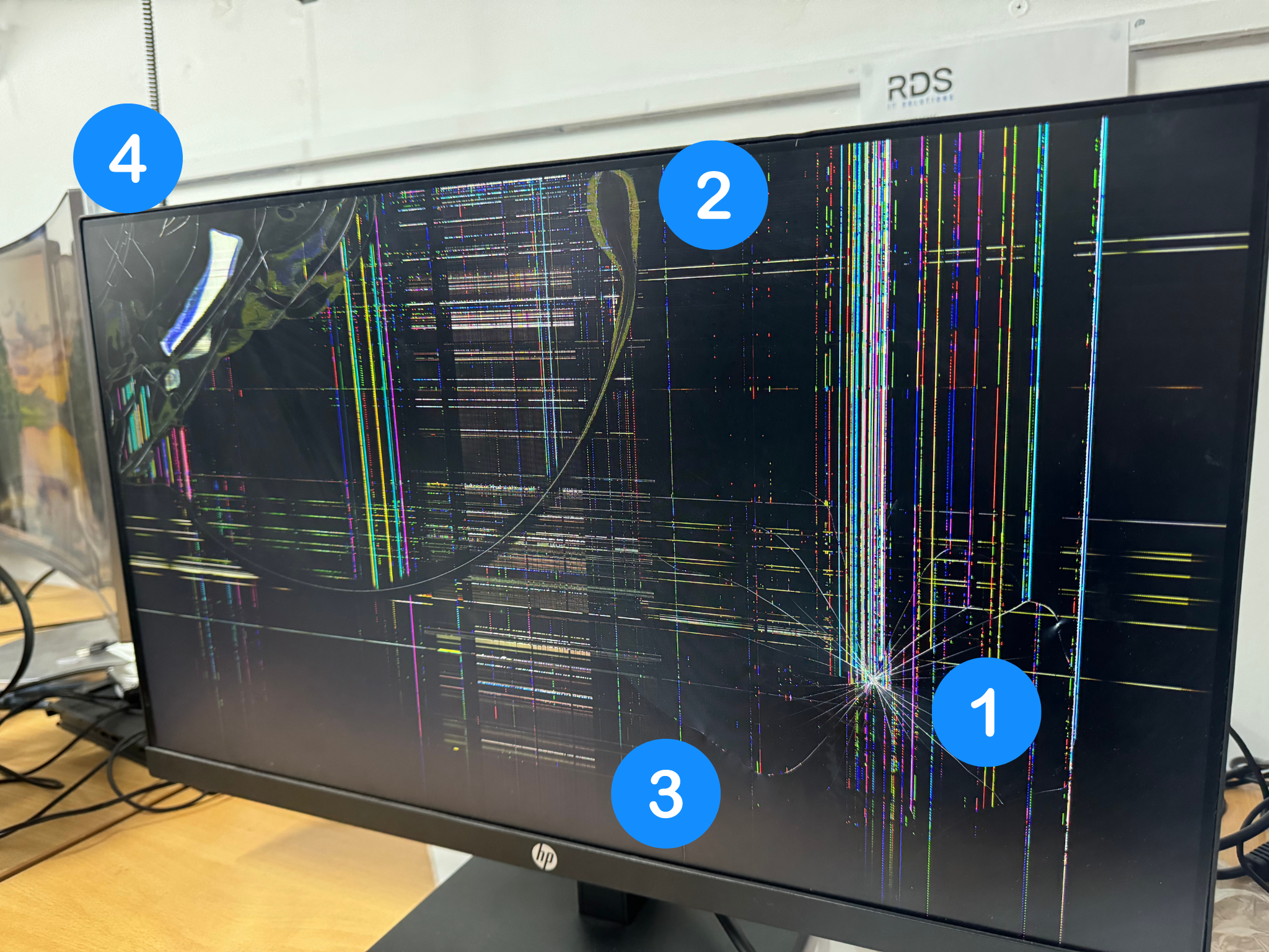 Very easy to recognise, if you see this on your screen or monitor it has most likely been impacted with something. This can be identified by lines and cracks spreading from a single point of origin, and you may notice that the point of origin is a little sunken.